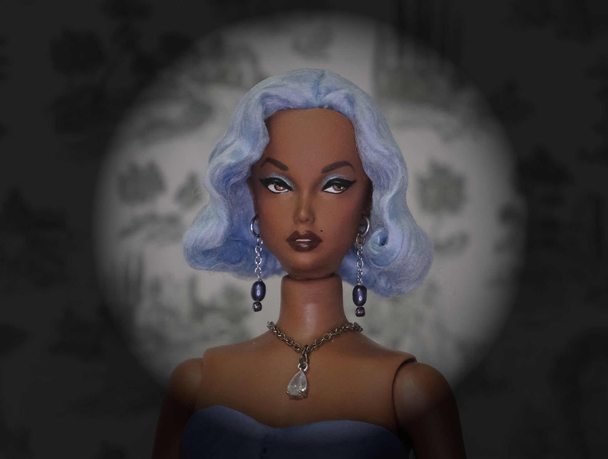 What's included: A hand painted doll with her custom clothing and accessories, 1 resin stand with metal prongs, 1 interchangeable magnetic wig and a wigblock.