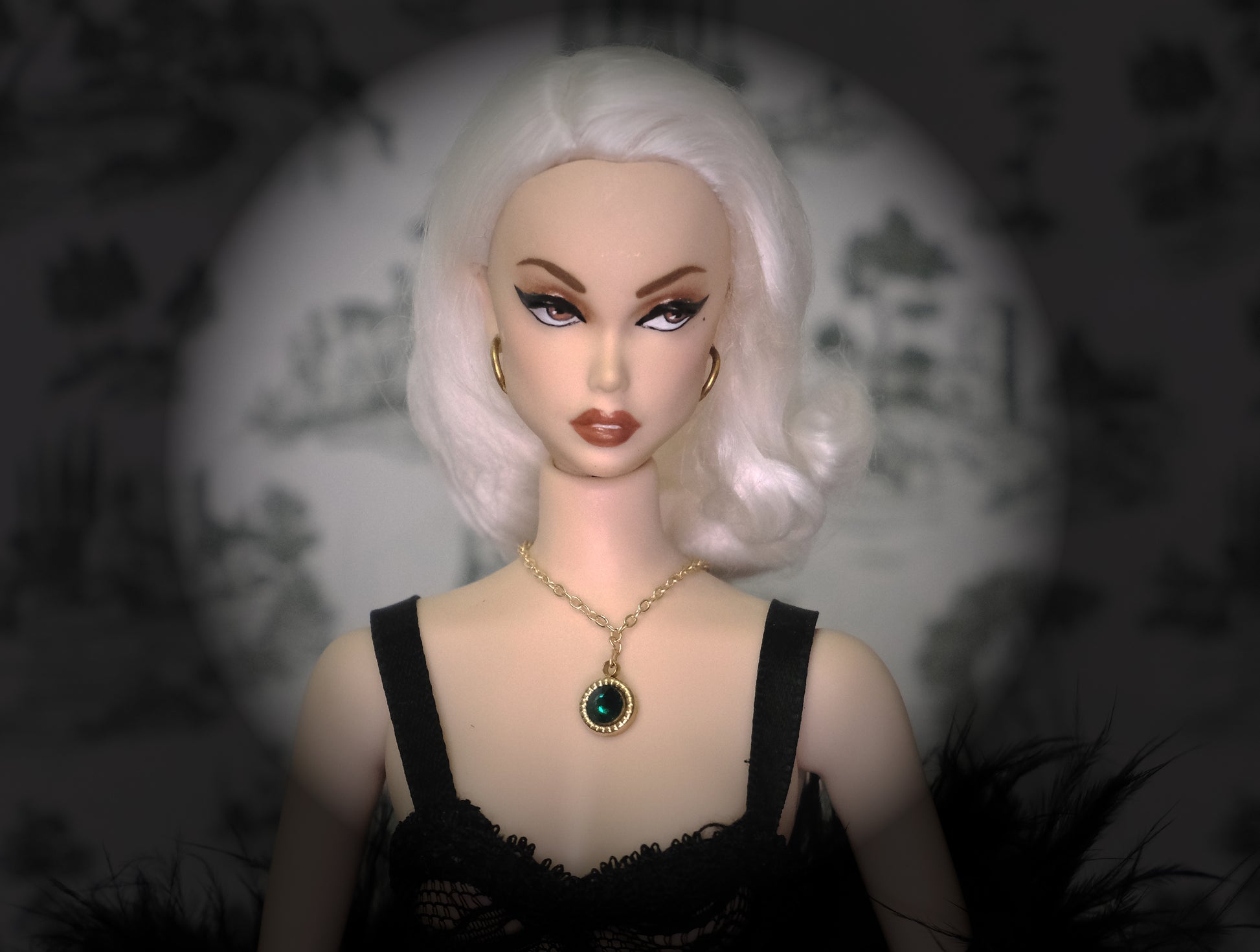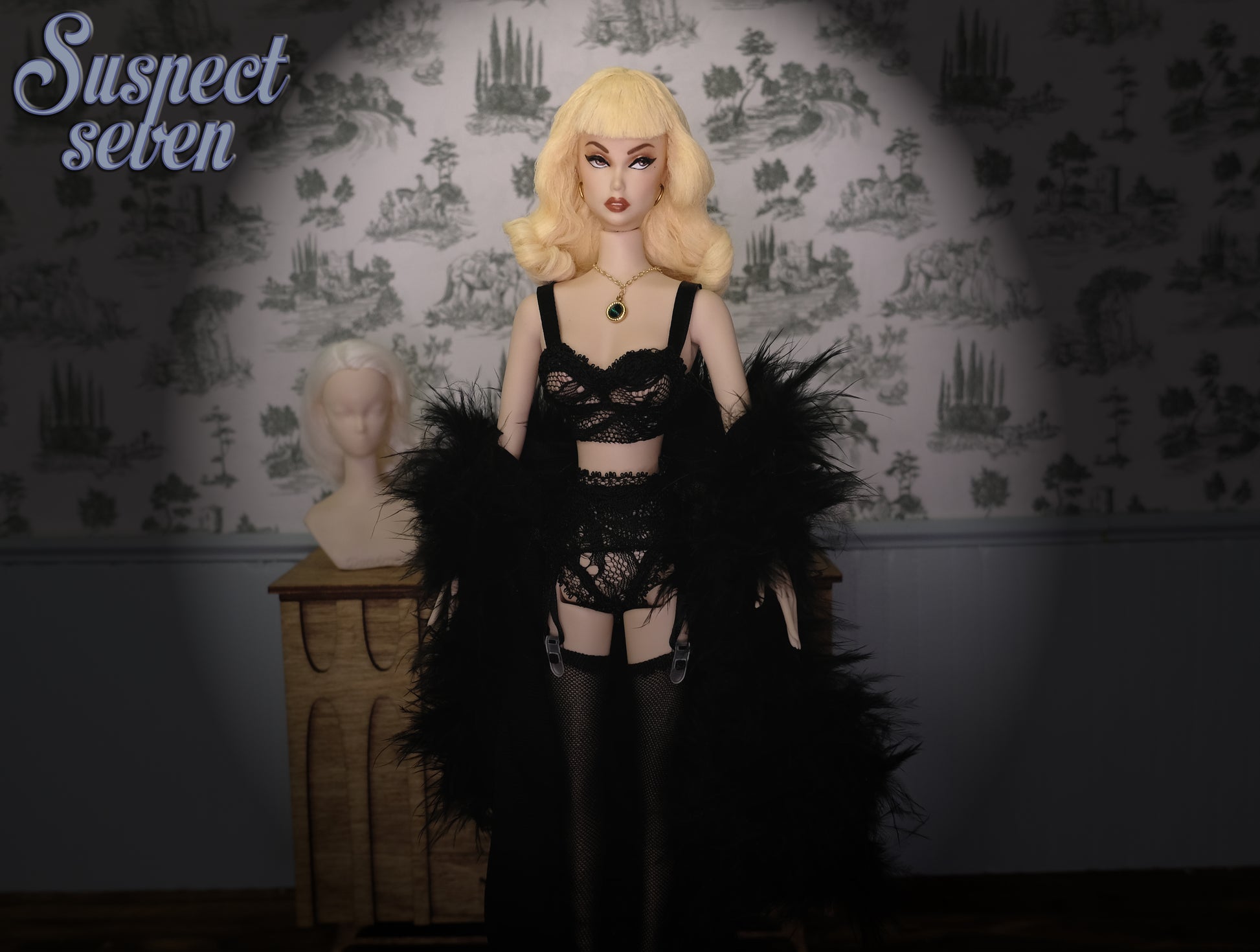 What's included: A hand painted doll with her custom clothing and accessories, 1 resin stand with metal prongs, 1 interchangeable magnetic wig and a wigblock.
